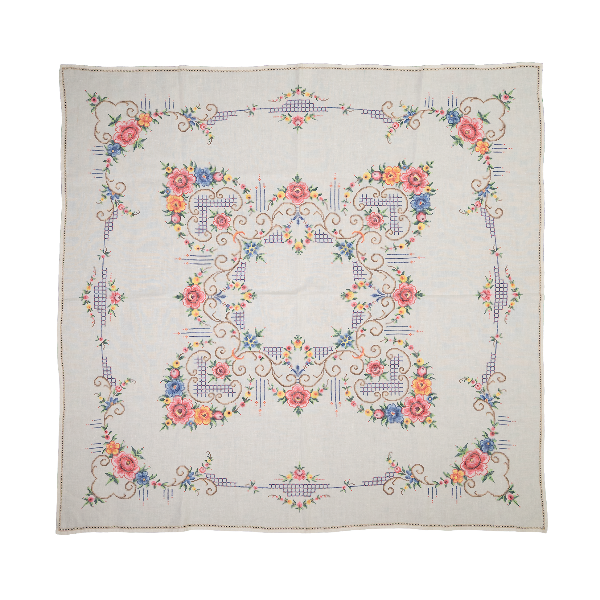 - A hand-selected vintage embroidered tablecloth, chosen for its timeless elegance and unique character.