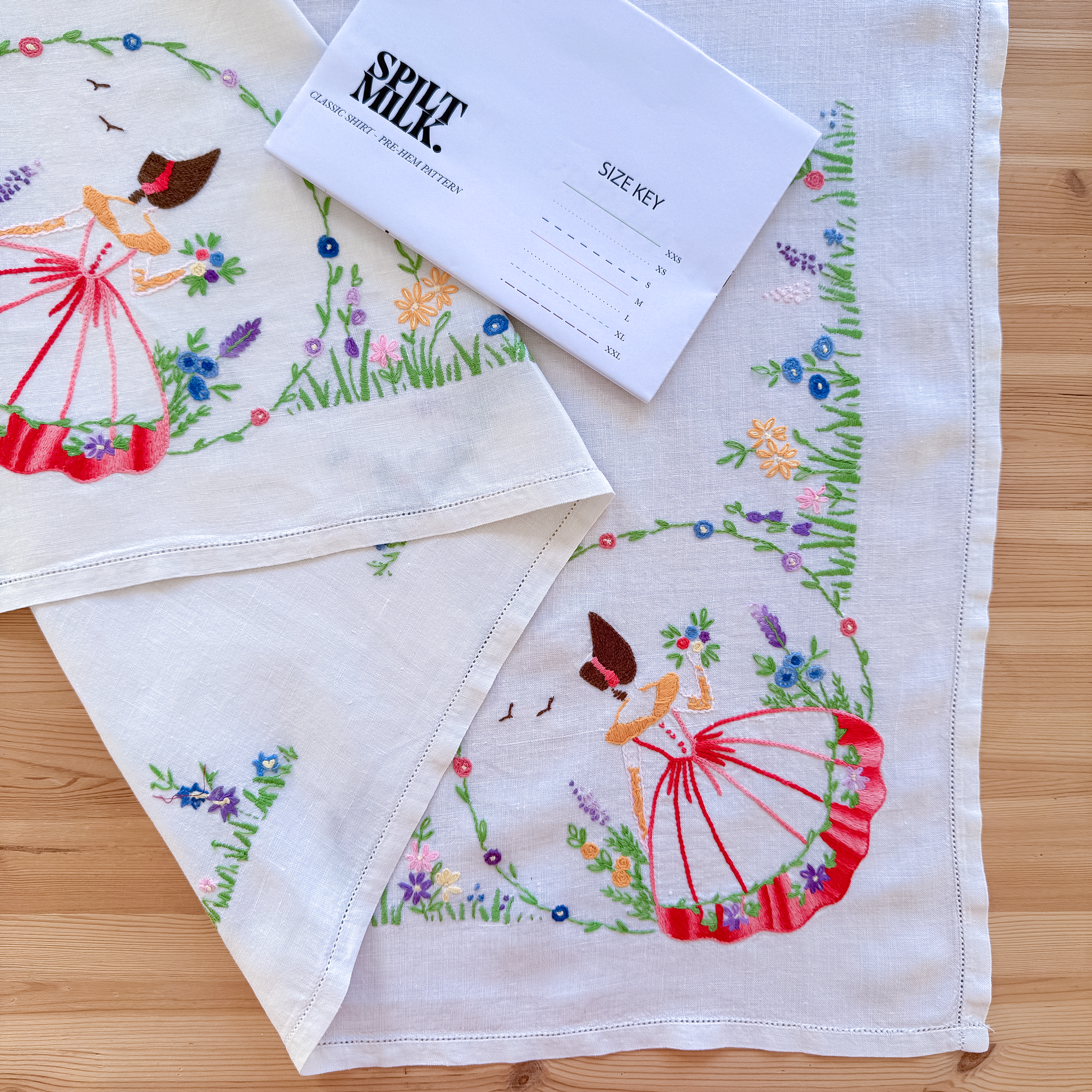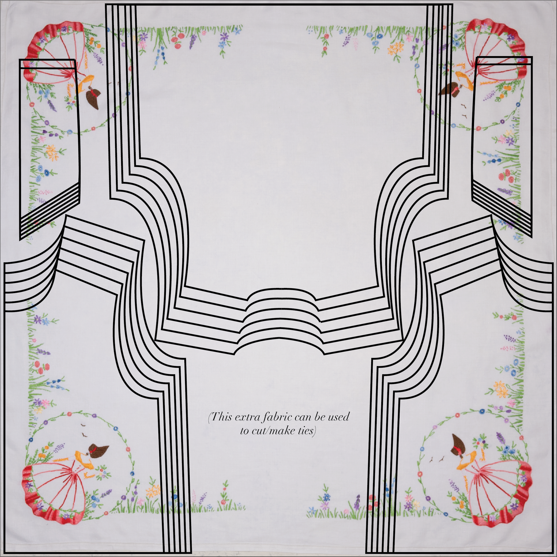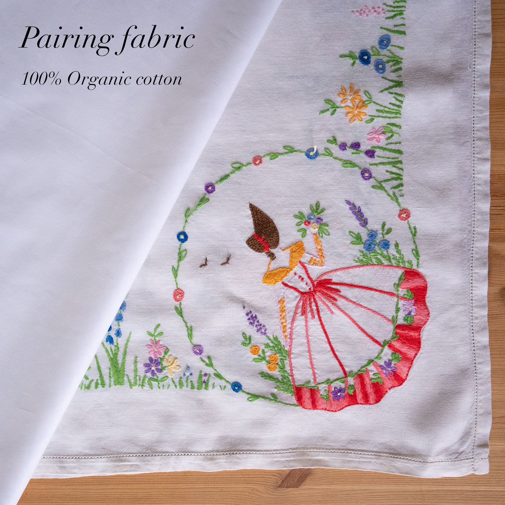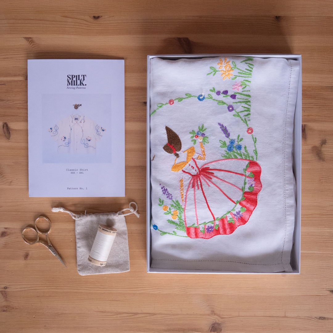 Note: Tablecloths are vintage and may exhibit wear or staining. The kit’s pattern placement and construction have been optimised to minimise any impact on garment integrity and appearance.