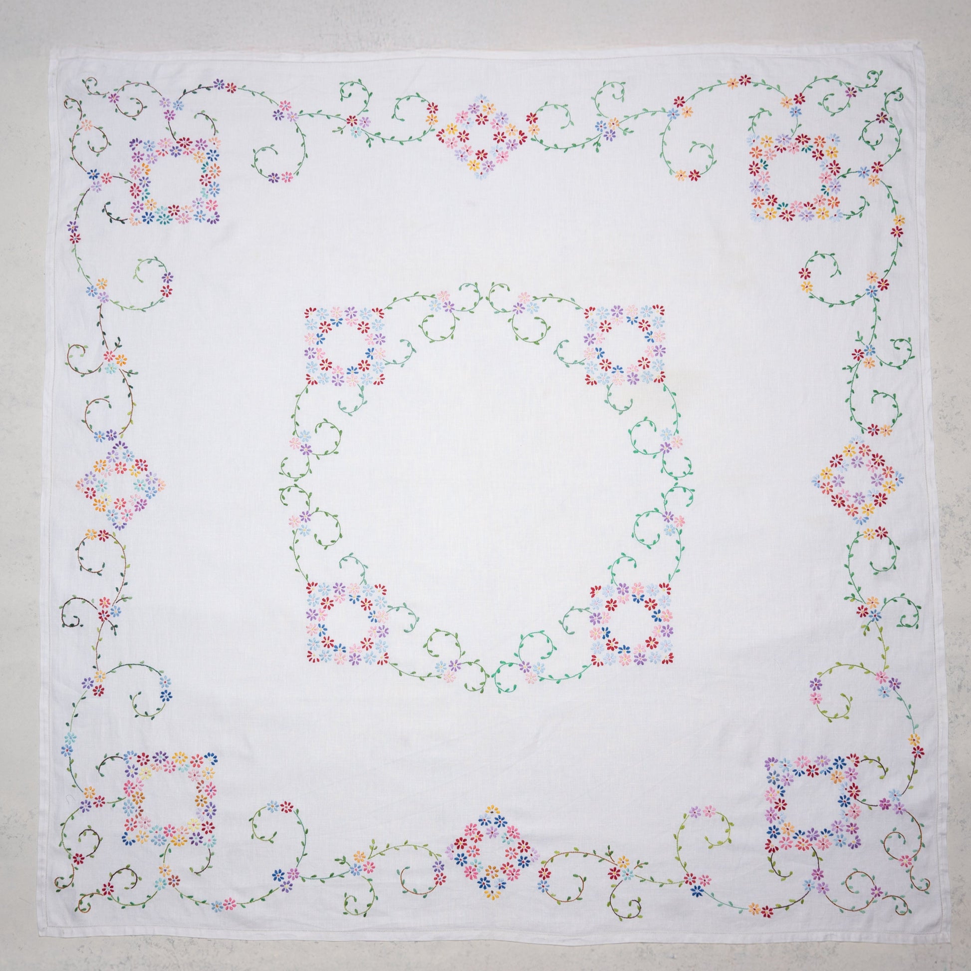- A hand-selected vintage embroidered tablecloth, chosen for its timeless elegance and unique character.
