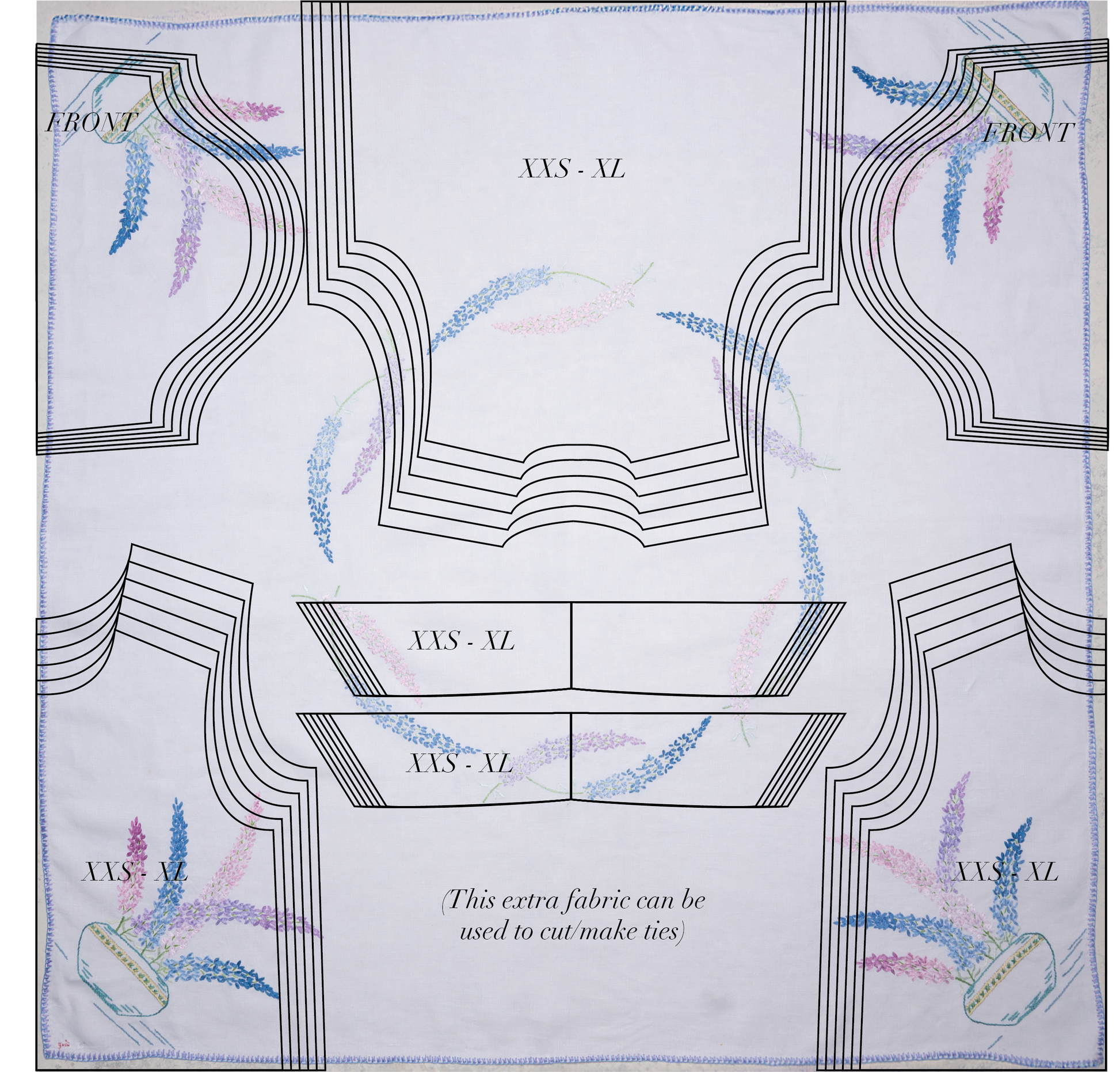 Note: Tablecloths are vintage and may exhibit wear or staining. The kit’s pattern placement and construction have been optimized to minimize any impact on garment integrity and appearance.