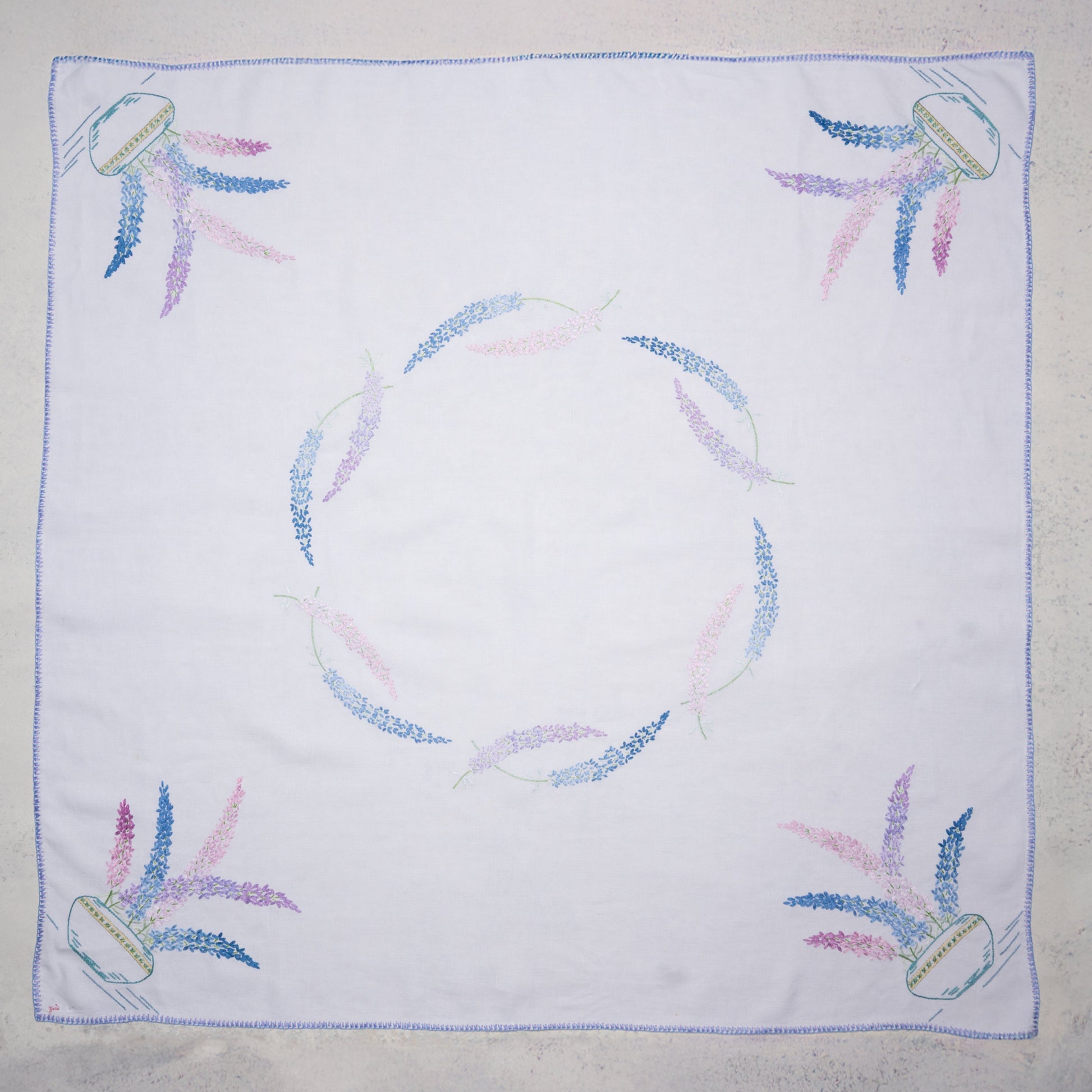 - A hand-selected vintage embroidered tablecloth, chosen for its timeless elegance and unique character.