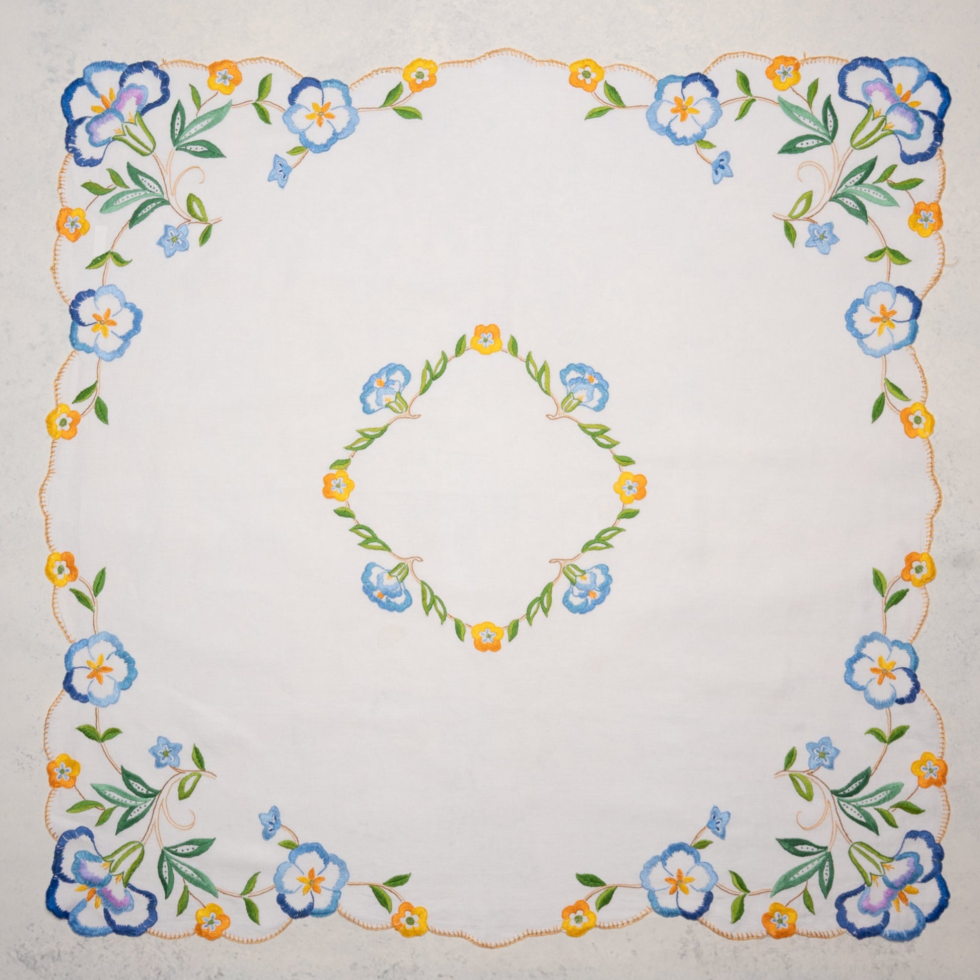 - A hand-selected vintage embroidered tablecloth, chosen for its timeless elegance and unique character.