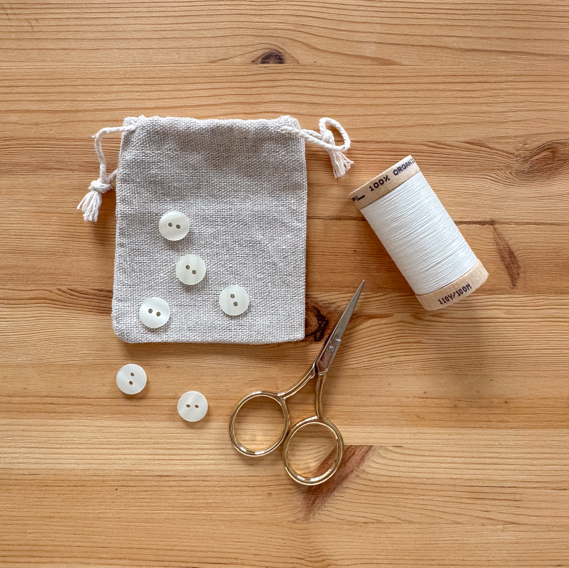 - A set of vintage buttons, carefully matched to complement your fabric’s design. (Please note: buttons shown are examples—each kit includes a unique selection.)
