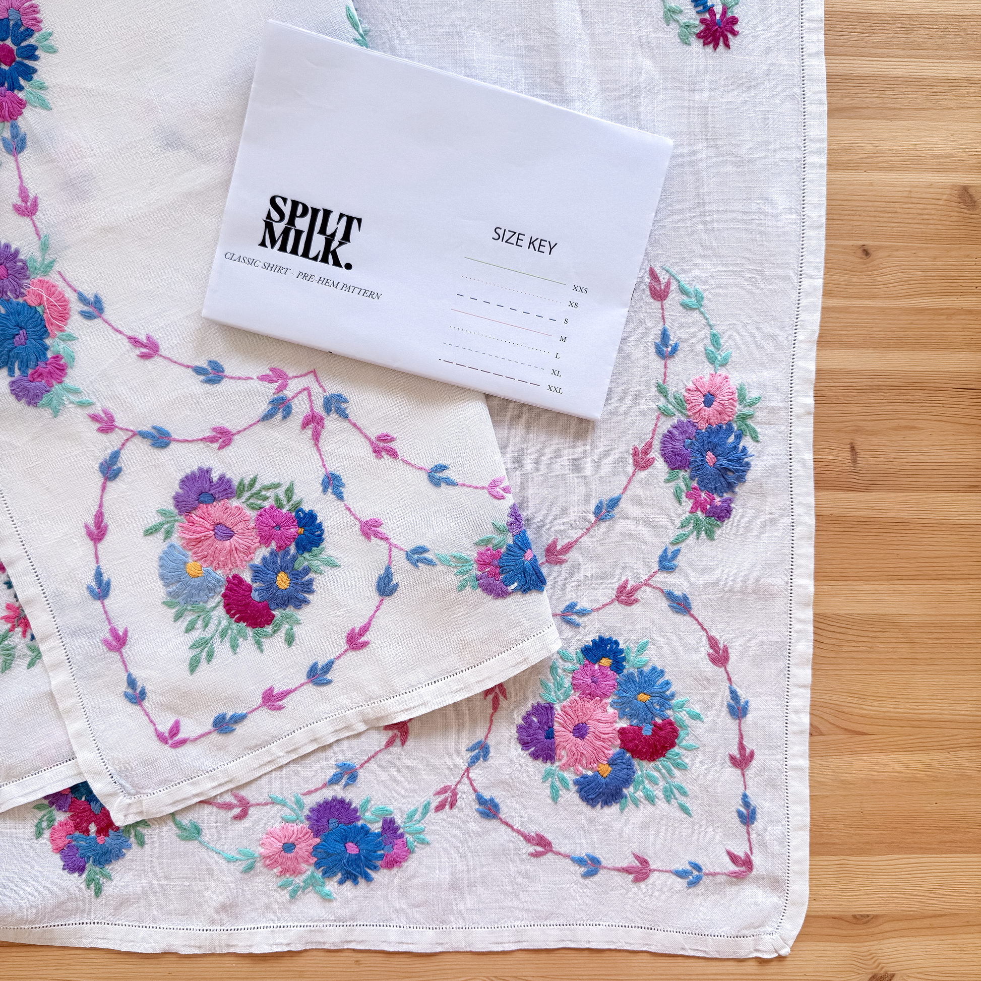 Note: Tablecloths are vintage and may exhibit wear or staining. The kit’s pattern placement and construction have been optimised to minimise any impact on garment integrity and appearance.