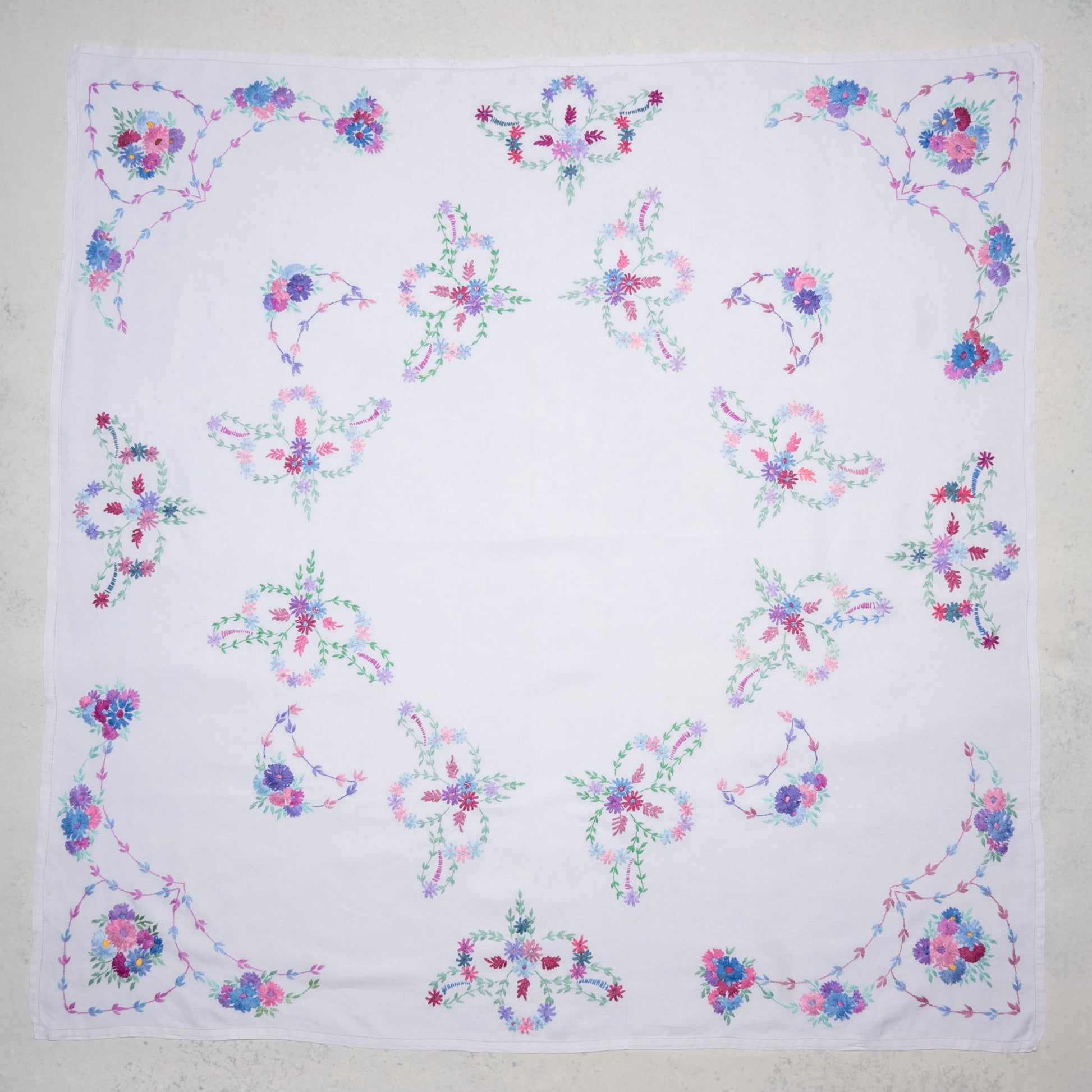 - A hand-selected vintage embroidered tablecloth, chosen for its timeless elegance and unique character.
